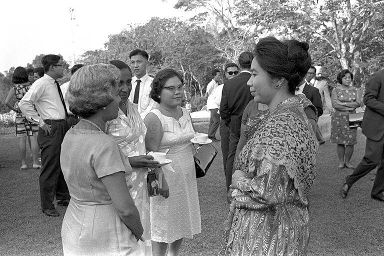 TOH PUAN NOOR AISHAH, WIFE OF YANG DI-PERTUAN NEGARA OF SINGAPORE YUSOF ISHAK, WITH GUESTS AT TEA RECEPTION FOR MALAYSIAN SCHOOLS' ATHLETES HELD AT ISTANA NEGARA