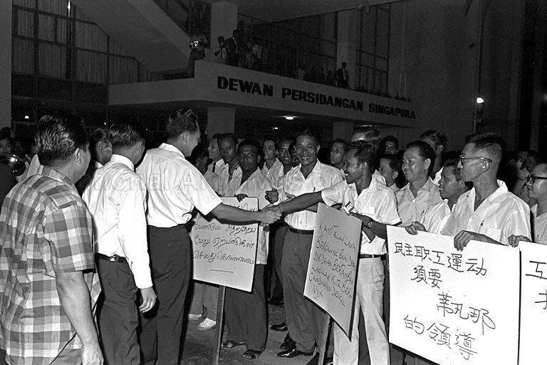 PRIME MINISTER LEE KUAN YEW GREETING PROTESTORS AT THE OPENING OF SINGAPORE CONFERENCE HALL AND TRADE UNION HOUSE IN SHENTON WAY