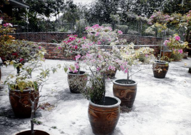 A HUGE BRICK WALL WATER WELL AND POTTED BOUGAINVILLEA PLANTS ON CONCRETE PAVEMENT AT MAIN FARM HOUSE AT 3757 LIM CHU KANG ROAD