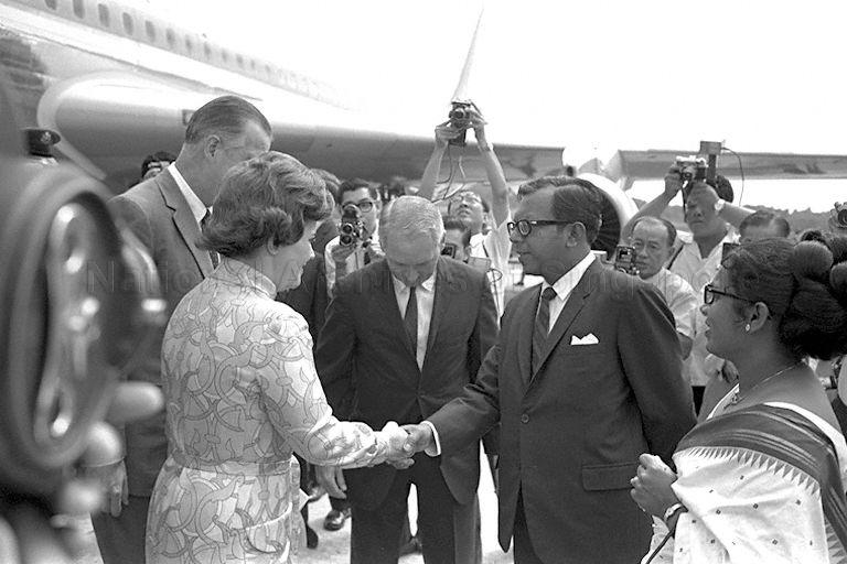 VICE PRESIDENT OF UNITED STATES SPIRO AGNEW AND MRS JUDY AGNEW BEING GREETED BY MR AND MRS PUNCH COOMARASWAMY AT PAYA LEBAR AIRPORT
