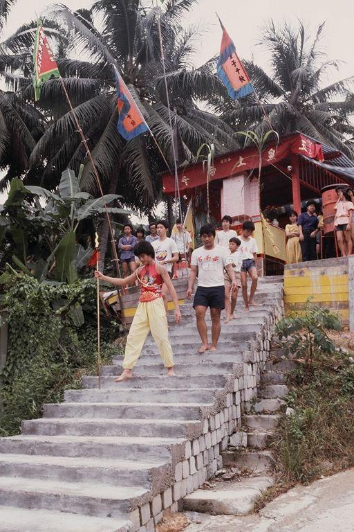DAIRY FARM ROAD "THIRD PRINCE LA CHA" BIRTHDAY CELEBRATIONS -- MEDIUM POSSESSED BY THE "THIRD PRINCE LA CHA" PROCEEDING DOWN THE STAIRS IN FRONT OF THE TEMPLE
