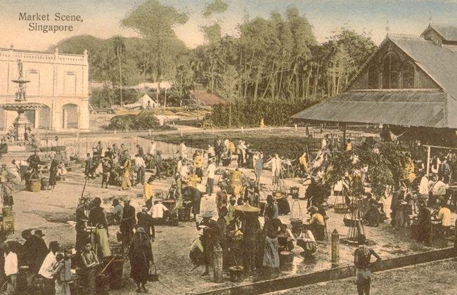 Hawkers at "Koek's Bazaar" at Orchard Road and Cuppage Road before the construction of the brick facade in 1909. On the right stands Orchard Road Market.