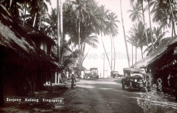Corner where end of Upper East Coast Road meets beginning of Bedok Road (perpendicular to foreground). The whole stretch of coast from here towards Tanjong Rhu was known as Tanjong Katong at that time. The rear-doored "mosquito bus" in the centre of this postcard was the only means of public transport to the area.