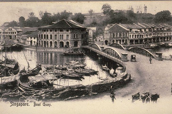 View of Read Bridge crossing the Singapore River at the uppermost limit of Boat Quay, with Fort Canning Hill visible in the background