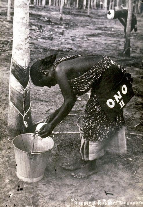 INDIAN LADY TAPPING RUBBER IN A RUBBER TREE PLANTATION