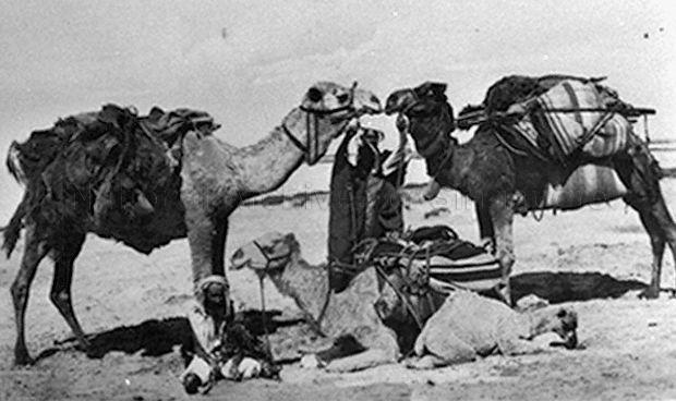 2 CAMELS AND THIER OWNERS AT EL KANTARA, EGYPT, 1930. PHOTOGRAPH BELONGING TO MEMBER OF RAF.