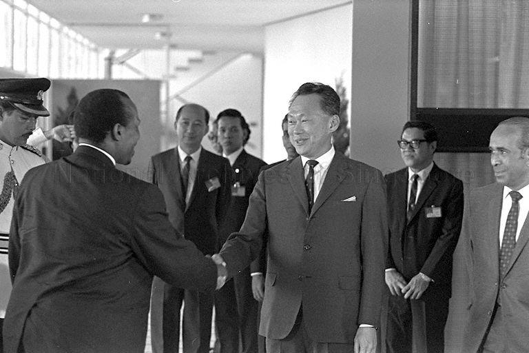 PRIME MINISTER LEE KUAN YEW WELCOMING DELEGATES TO THE OPENING DAY OF THE COMMONWEALTH HEADS OF GOVERNMENT MEETING AT SINGAPORE CONFERENCE HALL