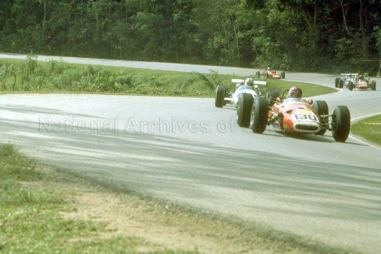 LIONEL CHAN'S BRABHAM AHEAD OF THE FORMULA FORD GAGGLE OF CARS THE TUPPENCE FORD, A PALLISER, AN ELDEN AND THE EX-BOB BIRRELL HAWKE DL2A.