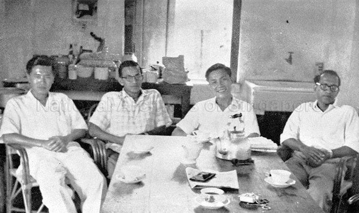 THE BATTLE FOR MERGER - (FROM RIGHT) C V DEVAN NAIR, FONG SWEE SUAN, S WOODHULL AND LIM CHIN SIONG AT ST JOHN'S ISLAND DETENTION CAMP. THE PICTURE WAS TAKEN BY LEE KUAN YEW WHEN HE PAID THEM A VISIT ON CHINESE NEW YEAR DAY IN 1959.