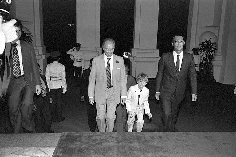 CANADIAN PRIME MINISTER PIERRE TRUDEAU WITH SON ALEXANDRE EMMANUEL SACHA TRUDEAU AND MINISTER FOR DEFENCE AND SECOND MINISTER FOR HEALTH GOH CHOK TONG ARRIVING FOR DINNER HOSTED BY PRIME MINISTER LEE KUAN YEW AT ISTANA