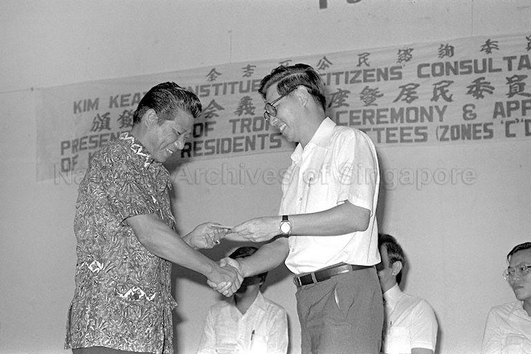 COMMUNICATIONS AND CULTURE MINISTER ONG TENG CHEONG PRESENTING CERTIFICATES AT KIM KEAT RESIDENTS' COMMITTEE TROPHIES PRESENTATION AND APPOINTMENT CEREMONY AT THE KIM KEAT COMMUNITY CENTRE