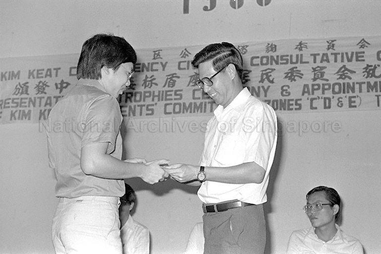 COMMUNICATIONS AND CULTURE MINISTER ONG TENG CHEONG PRESENTING CERTIFICATES AT KIM KEAT RESIDENTS' COMMITTEE TROPHIES PRESENTATION AND APPOINTMENT CEREMONY AT THE KIM KEAT COMMUNITY CENTRE