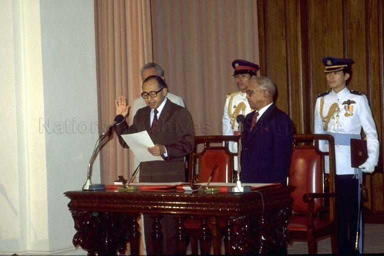 MINISTER FOR NATIONAL DEVELOPMENT TEH CHEANG WAN TAKING HIS OATH OF ALLEGIANCE BEFORE PRESIDENT C V DEVAN NAIR (CENTRE) AND PRIME MINISTER LEE KUAN YEW (LEFT, PARTIALLY HIDDEN) DURING THE SWEARING-IN CEREMONY OF THE CABINET MINISTERS AT THE ISTANA