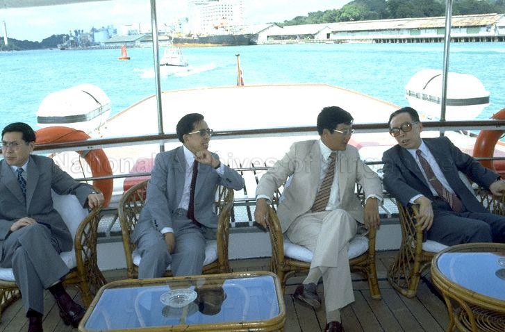 FOREIGN MINISTER OF CHINA MR WU XUEQIAN WITH PORT OF SINGAPORE AUTHORITY (PSA) GENERAL MANAGER MR WONG HUNG KHIM ON BOARD FERRY DURING VISIT TO PORT OF SINGAPORE AUTHORITY (PSA), MARITIME SQUARE