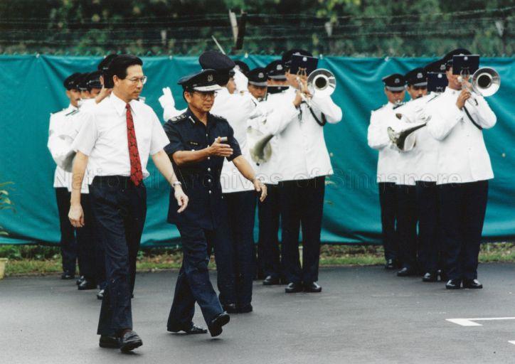 COMMISSIONER OF POLICE TEE TUA BA (SECOND FROM LEFT) ACCOMPANYING PRESIDENT ONG TENG CHEONG ON HIS ARRIVAL DURING HIS VISIT TO THE SINGAPORE POLICE FORCE AT POLICE ACADEMY.