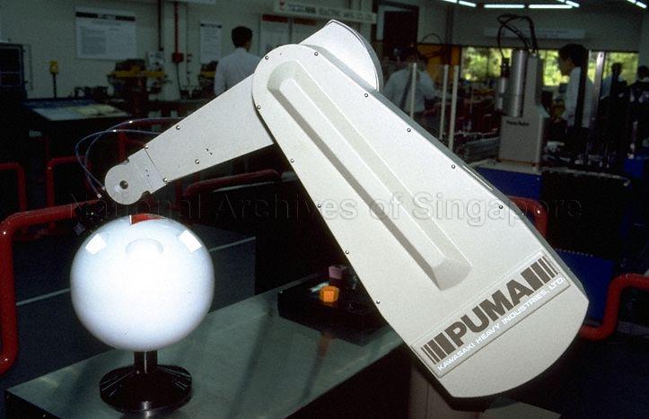 MECHANICAL ROBOT ON DISPLAY AT OPENING OF AUTOMATION APPLICATIONS CENTRE OF ROBOT LEASING AND CONSULTANCY PTE LTD, BLK 161 SCIENCE PARK BY MINISTER OF STATE FOR DEFENCE AND TRADE AND INDUSTRY BRIGADIER-GENERAL LEE HSIEN LOONG