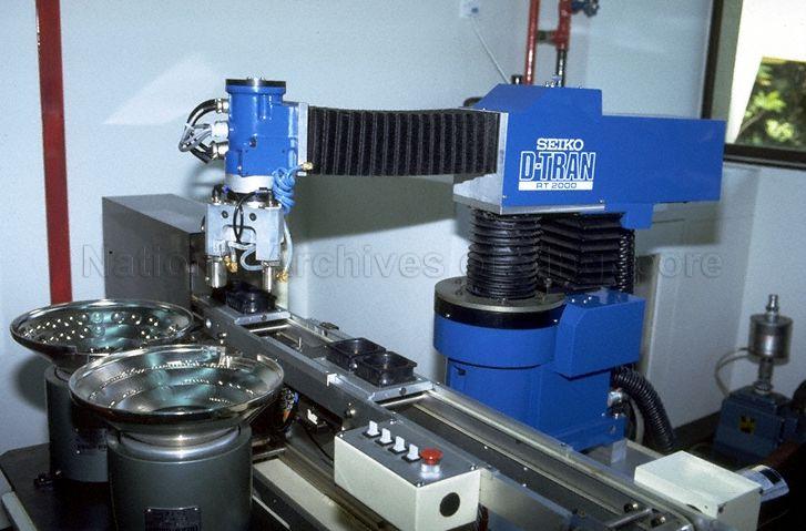 MECHANICAL ROBOT ON DISPLAY AT OPENING OF AUTOMATION APPLICATIONS CENTRE OF ROBOT LEASING AND CONSULTANCY PTE LTD, BLK 161 SCIENCE PARK BY MINISTER OF STATE FOR DEFENCE AND TRADE AND INDUSTRY BRIGADIER-GENERAL LEE HSIEN LOONG