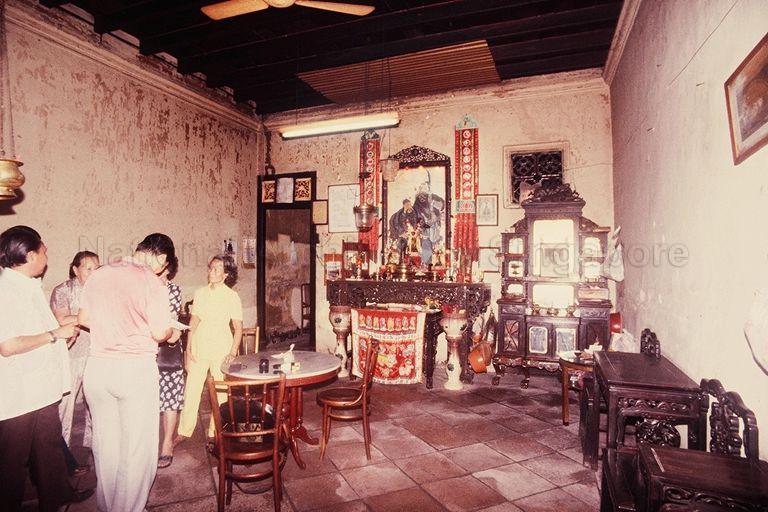 THE INTERIOR OF THE TEMPLE AT LOWER DELTA ROAD WITH THE ALTAR TO "KWAN KONG"; THE LADY IN YELLOW IS A MEDIUM