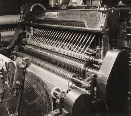 WOOL PROCESSING: CARDING. ON A BRITISH CARDING MACHINE A FINE WEB OF WOOL PASSES THROUGH THE CONDENSER. THIS DIVIDES THE WOOL WEB INTO STRIPS, EACH HALF AN INCH WIDE, AND CONDENSES THESE INTO LOOSE "ROPES" READY FOR WINDING ON A BEAM, OR BOBBIN. (SHAW BROTHERS LTD., HUDDERSFIELD, YORKSHIRE, ENGLAND).