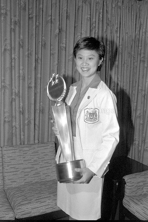1985 BEST SPORTSWOMAN BOWLER ADELINE WEE WITH HER TROPHY RECEIVED DURING 1985 SINGAPORE NATIONAL OLYMPIC COUNCIL SPORTS AWARDS PRESENTATION AT NATIONAL DEVELOPMENT BUILDING