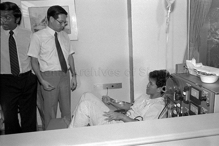 NATIONAL KIDNEY FOUNDATION (NKF) HONORARY SECRETARY T T DURAI (LEFT) ACCOMPANYING GUEST OF HONOUR SECOND DEPUTY PRIME MINISTER ONG TENG CHEONG ON TOUR OF FACILITIES AT SINGAPORE AIRLINES LIMITED (SIA) - NATIONAL KIDNEY FOUNDATION (NKF) SATELLITE DIALYSIS CENTRE AT BLOCK 225, LORONG 8, TOA PAYOH AFTER ITS OPENING.