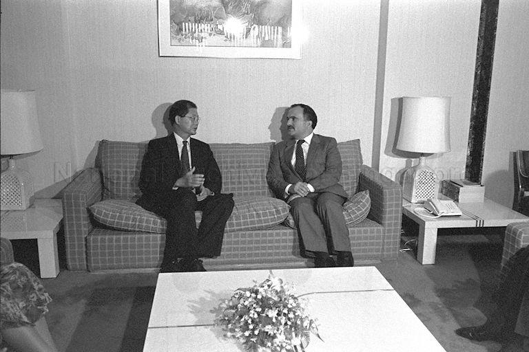 CROWN PRINCE HASSAN OF JORDAN BEING WELCOMED BY MINISTER OF STATE FOR EDUCATION DR TAY ENG SOON UPON ARRIVAL AT SINGAPORE CHANGI AIRPORT FOR A TWO-DAY OFFICIAL VISIT