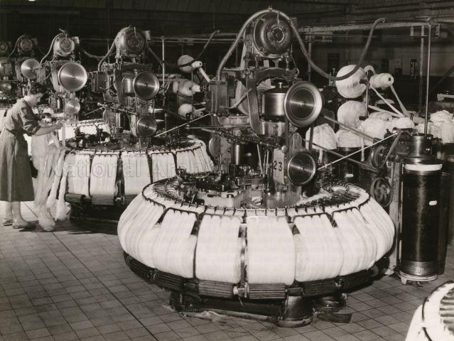 WOOL PROCESSING: COMBING. AN OPERATOR TENDS THE WOOL BEING FED INTO THESE NOBLE COMB MACHINES, WHICH ARE SUITABLE FOR ALL FINE AND MEDIUM QUALITY WOOLS. THE COMBS ARE SEEN IN ONE OF THE WORLD'S LARGEST WORSTED SPINNING MILLS. (PATON AND BALDWINS LTD., DARLINGTON, COUNTY DURHAM, ENGLAND.)