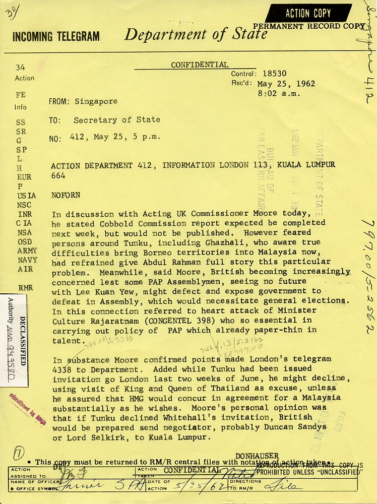 American Consulate General Singapore informed Secretary of State that the Cobbold Commission report is expected to be completed soon, but would not be published. They feared people around Tunku Abdul Rahman may inform him of the difficulties in bringing the Borneo territories into Malaysia. Tunku had been invited to go to London in June but he may decline unless he is assured that the British would concur in agreement for a Malaysia as he wishes. However, if Tunku declines Whitehall's invitation, the British would send a negotiator to Kuala Lumpur, probably Duncan Sandys or Lord Selkirk.